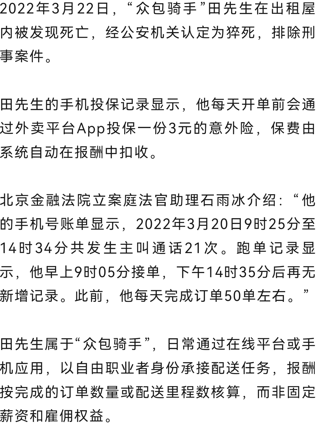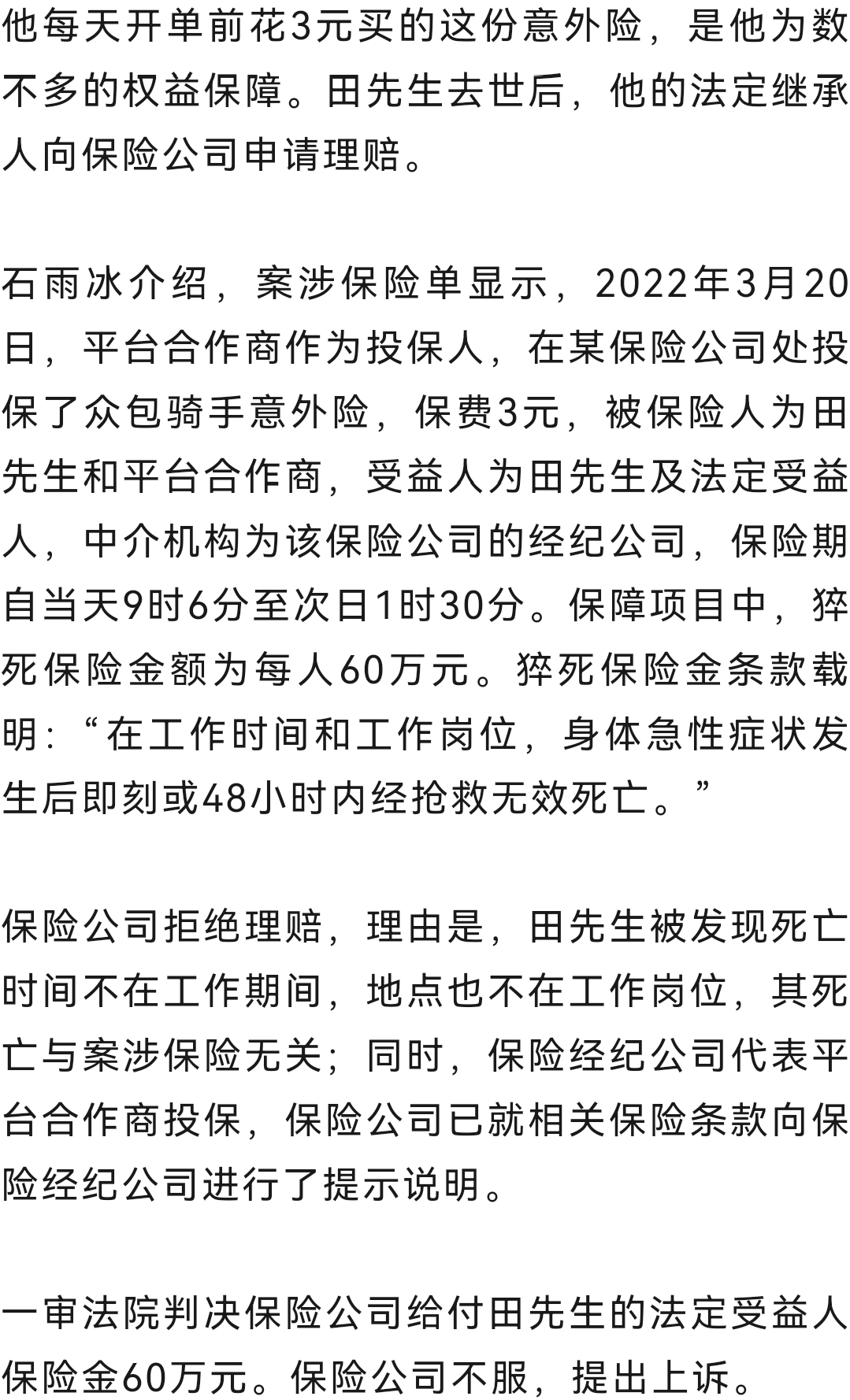 騎手田先生每天開單前會通過外賣平臺App投保一份3元的意外險,保費由平臺在其報酬中自動扣除。然而,當田先生在出租屋內猝死后,家屬申請理賠卻遭到拒絕,保險公司給出的理由是“事故發生于非工作時間地點,且投保人為平臺而非騎手本人”。
