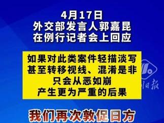 新華社北京4月17日電(記者馬卓言、馮歆然) 外交部發言人郭嘉昆17日在例行記者會上答問時說,近年來,針對中國駐日外交機構的滋擾和挑釁不斷,近期更是出現自衛隊現役官員持刀闖館等一系列嚴重惡性事件。這些事件接踵而至,性質影響惡劣,暴露出當前日本存在的諸多深層問題。