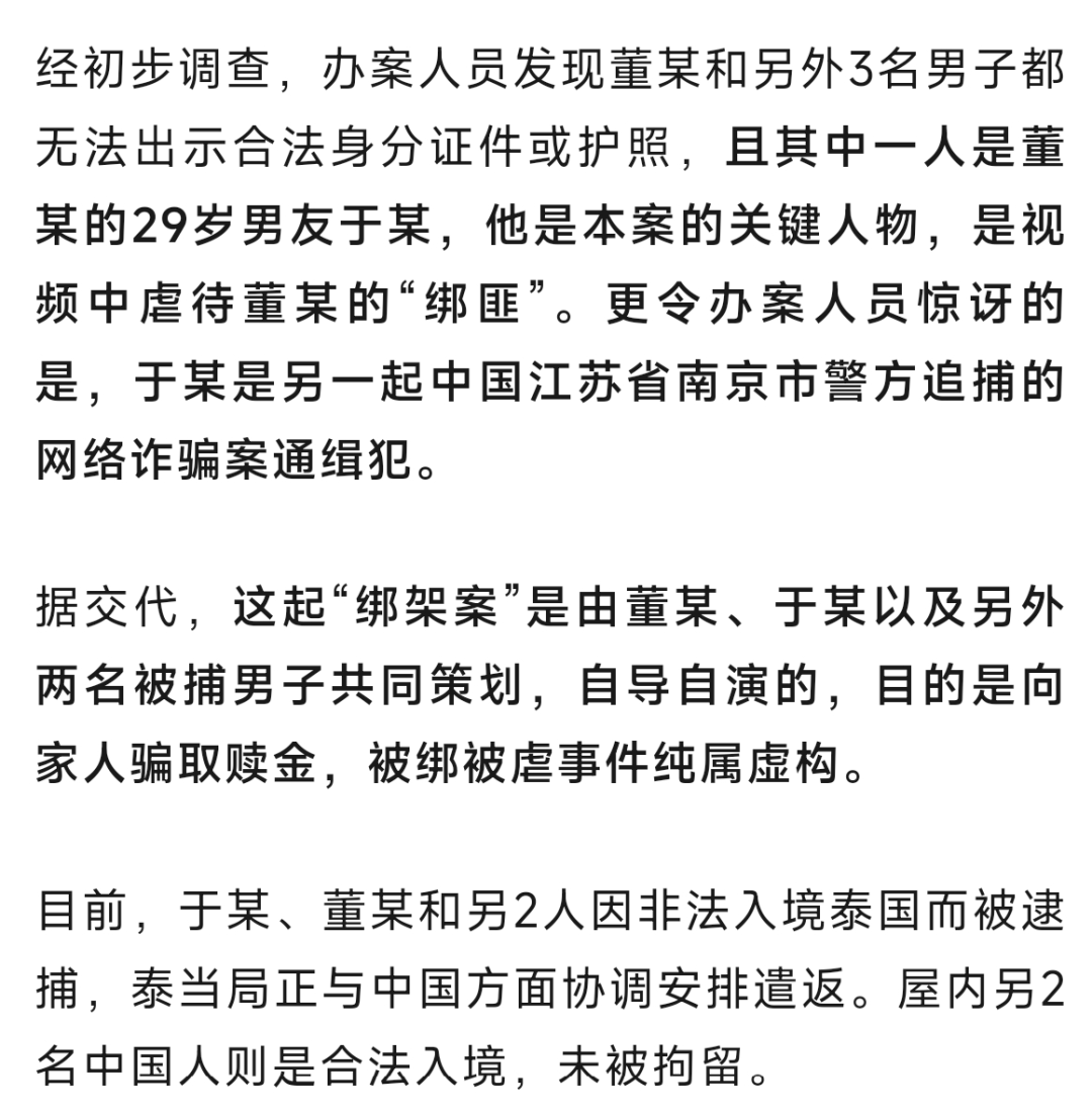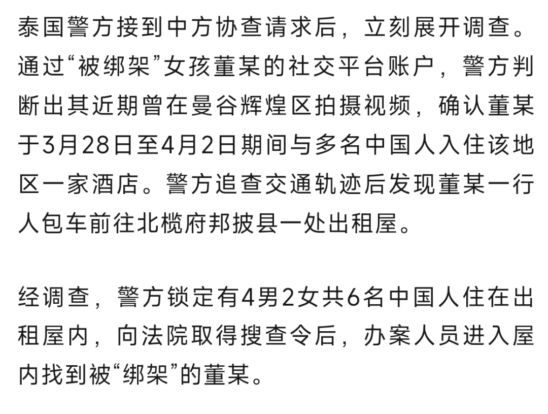 本案源于一名中國父親支付贖金后女兒仍未獲釋,遂向中國公安報警。泰國警方接獲中方協查請求后展開調查。4月16日,泰國中央調查局副局長納塔薩·查瓦納賽、移民局副局長潘塔納·努查納、打擊犯罪司司長帕塔納薩·布帕素旺聯手,在北欖府邦披縣邦繳鎮一處出租屋內,將4名中國籍嫌犯逮捕。