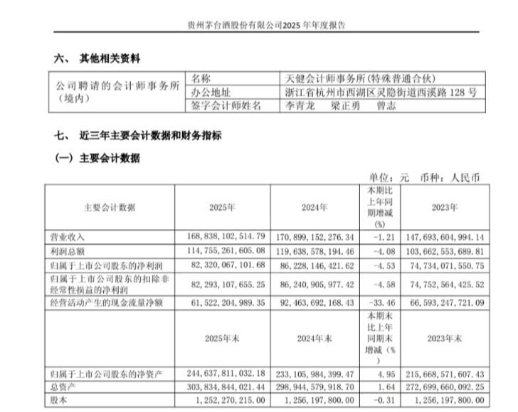 4月16日晚間,貴州茅臺(tái)披露2025年年度報(bào)告。報(bào)告顯示,2025年公司實(shí)現(xiàn)(酒類)營(yíng)業(yè)收入1688.38億元,同比下降1.21%;歸屬于上市公司股東的凈利潤(rùn)為823.20億元,同比下降4.53%。經(jīng)營(yíng)活動(dòng)產(chǎn)生的現(xiàn)金流量?jī)纛~為615.22億元,同比下降33.46%。