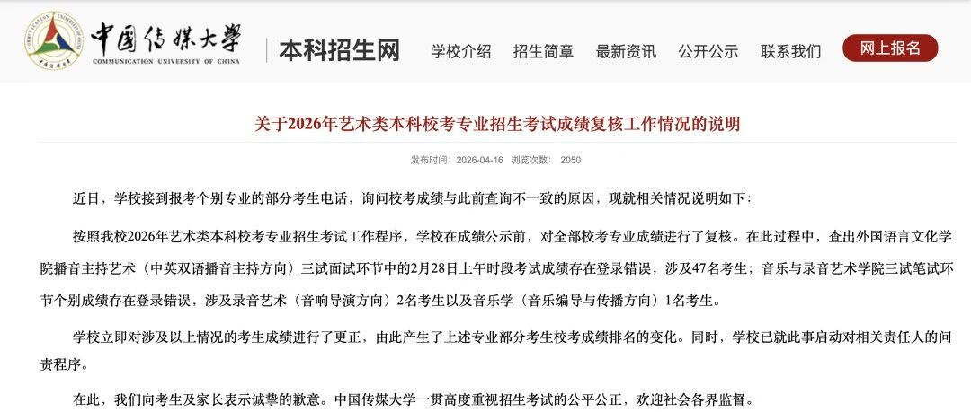 50名藝考生成績(jī)被登錯(cuò),中國(guó)傳媒大學(xué)致歉:成績(jī)已更正,啟動(dòng)對(duì)相關(guān)責(zé)任人問(wèn)責(zé)程序。