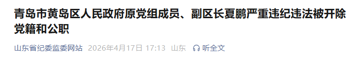 據青島市紀委監委消息:日前,經青島市委批準,青島市紀委監委對黃島區人民政府原黨組成員、副區長夏鵬嚴重違紀違法問題進行了立案審查調查。