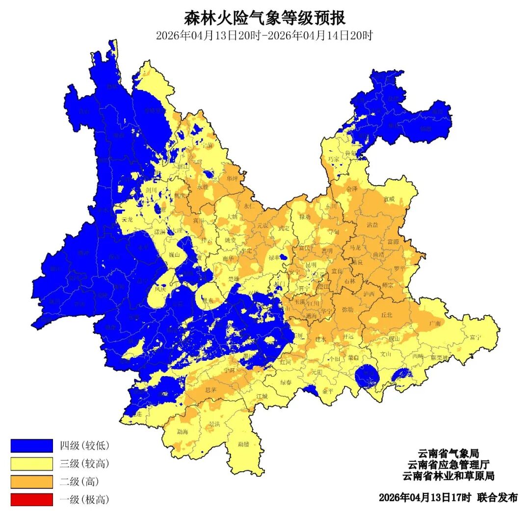 預計4月13日20時至4月14日20時,麗江市東南部、大理州東北部、楚雄州中部和北部、昆明市中部和東部、玉溪市東部、紅河州中北部、文山州西北部、曲靖市大部、普洱市中南部二級(高),迪慶州東部、麗江市中北部、大理州中西部、臨滄市東北部、普洱市南部和北部、西雙版納州、楚雄州東部和西部、昆明市西部、昭通市南部、玉溪市北部、紅河州中南部、文山州東部和南部、曲靖市北部三級(較高),其他地區四級(較低)。