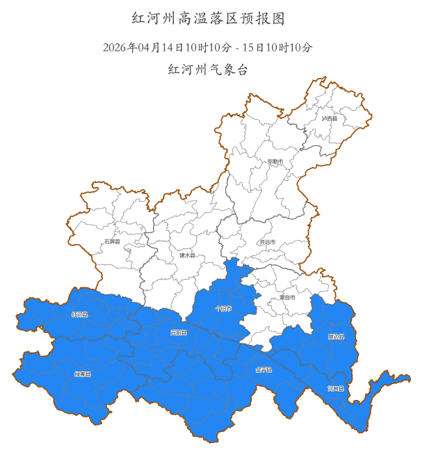 4月14日20時到4月15日20時:昭通市、曲靖市東部、文山州東部、迪慶州、怒江州、麗江市西部、大理州西部、保山市北部、德宏州北部多云有陣雨局部中雨,其他地區晴間多云。