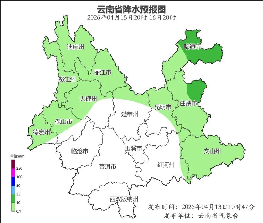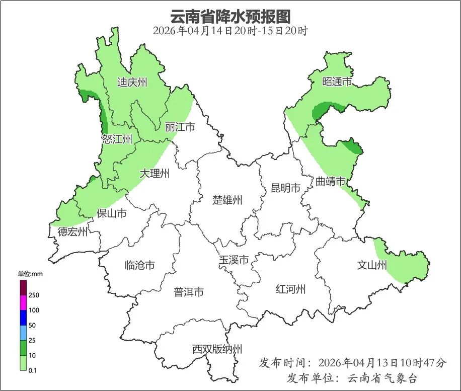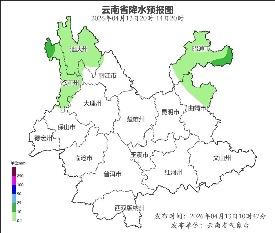 4月13日20時到4月14日20時:昭通市、曲靖市東北部、迪慶州、怒江州多云有陣雨局部中雨,其他地區晴間多云。