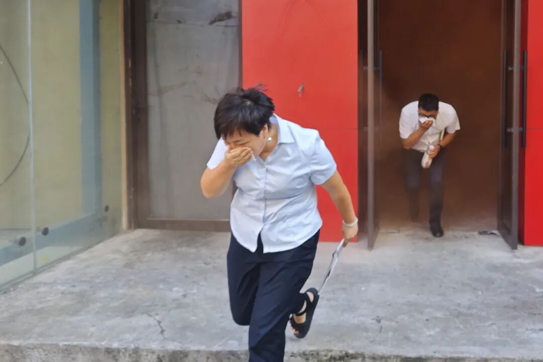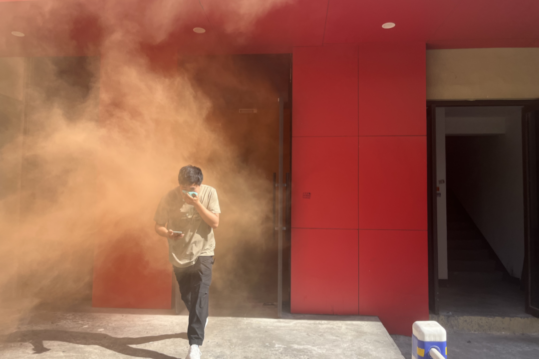 我們看見二樓窗戶冒出一股股黑煙,就馬上打119報警了,平常園區也經常開展消防培訓演練,當時想都沒想拿上滅火器就趕緊上樓幫忙了。