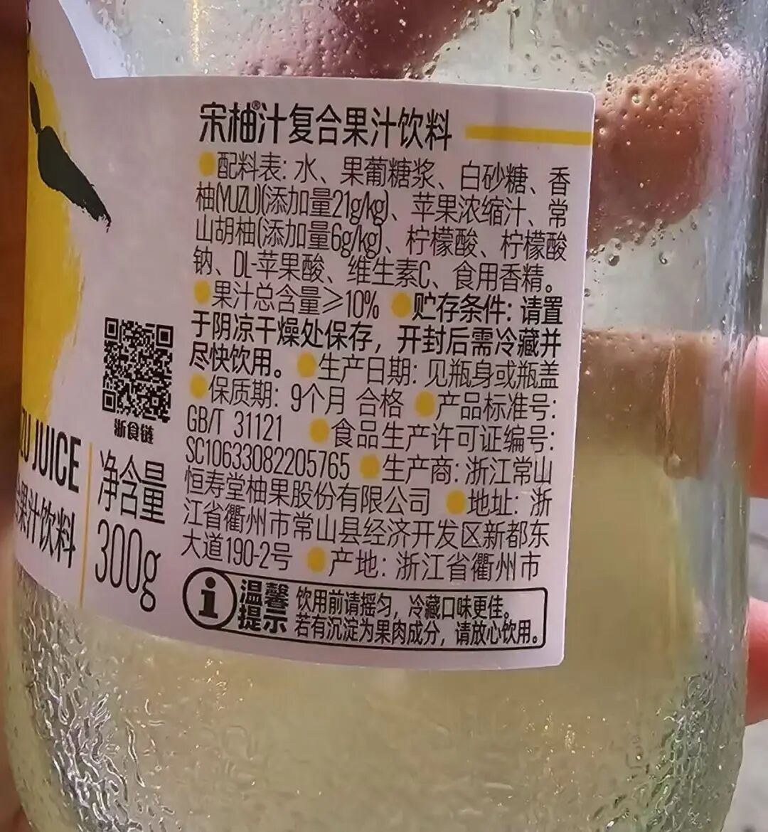 根據宋柚復合果汁飲料的配料表,這款飲品凈含量為300g,配料表前六位分別為:水、果葡糖漿、白砂糖、香柚、蘋果濃縮汁、胡柚。配料表信息顯示,香柚的添加量為21g/kg,胡柚的添加量為6g/kg,按照300g一瓶的規格,香柚的添加量為6.3g,胡柚的添加量為1.8g,兩者總計8.1g,含量占比達2.7%。