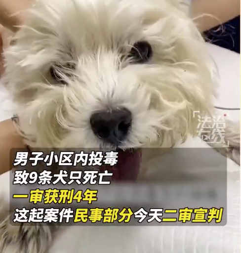 今天,男子小區(qū)內(nèi)投毒致9條犬只死亡案件,民事部分二審宣判,法院駁回上訴,維持原判。