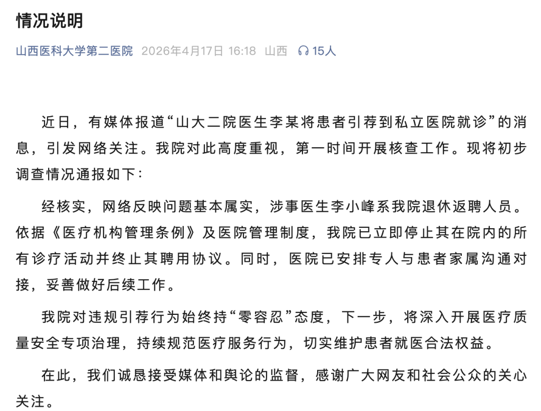 4月17日,山西醫(yī)科大學(xué)第二醫(yī)院發(fā)布情況說(shuō)明,回應(yīng)近日媒體報(bào)道“山大二院醫(yī)生李某將患者引薦到私立醫(yī)院就診”一事。