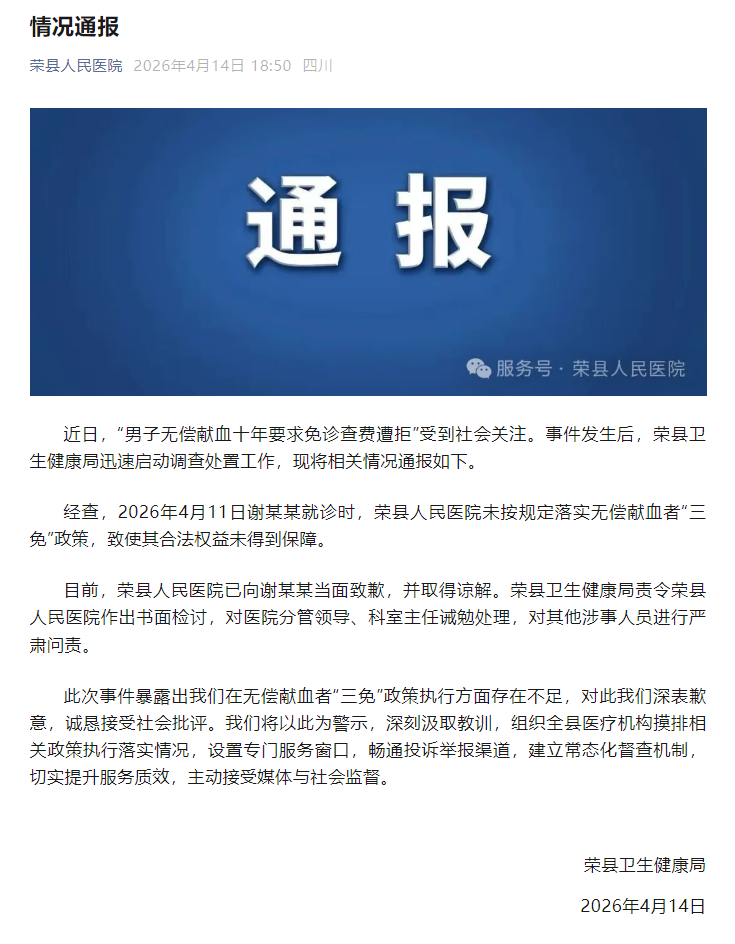 近日,“男子無償獻血十年要求免診查費遭拒”受到社會關注。事件發生后,榮縣衛生健康局迅速啟動調查處置工作,現將相關情況通報如下。