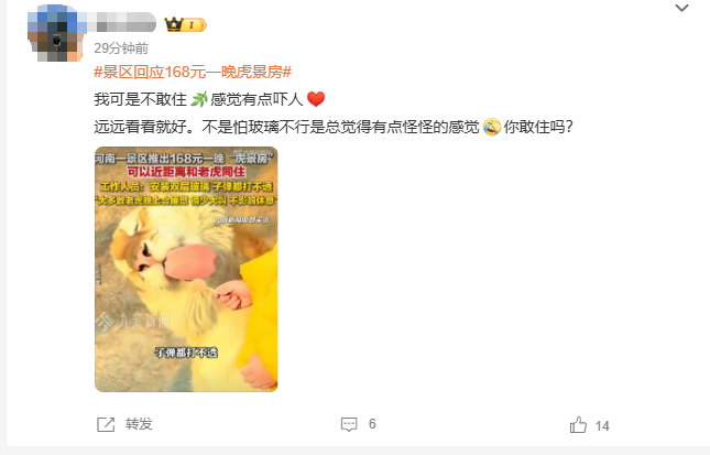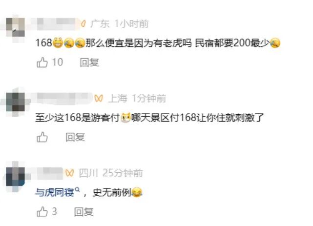 (元)那么便宜是因為有老虎嗎,民宿都要200最少”,還有網友戲稱此舉“與虎同寢,史無前例”。