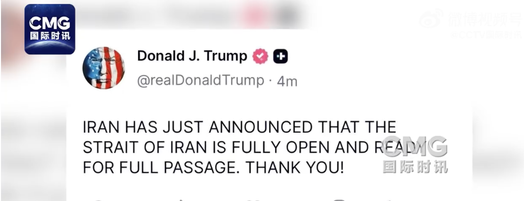 在伊朗外長阿拉格齊今天(4月17日)宣布霍爾木茲海峽將在黎以臨時停火期內開放后,美國總統(tǒng)特朗普在社交媒體發(fā)帖稱,“伊朗剛剛宣布霍爾木茲海峽全面開放,隨時準備通行。謝謝!”