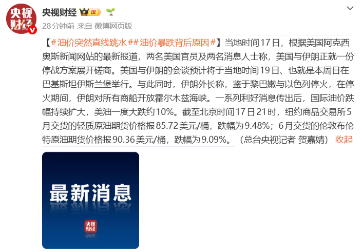 一系列利好消息傳出后,國際油價跌幅持續擴大,美油一度大跌約10%。截至北京時間17日21時,紐約商品交易所5月交貨的輕質原油期貨價格報85.72美元/桶,跌幅為9.48%;6月交貨的倫敦布倫特原油期貨價格報90.36美元/桶,跌幅為9.09%。
