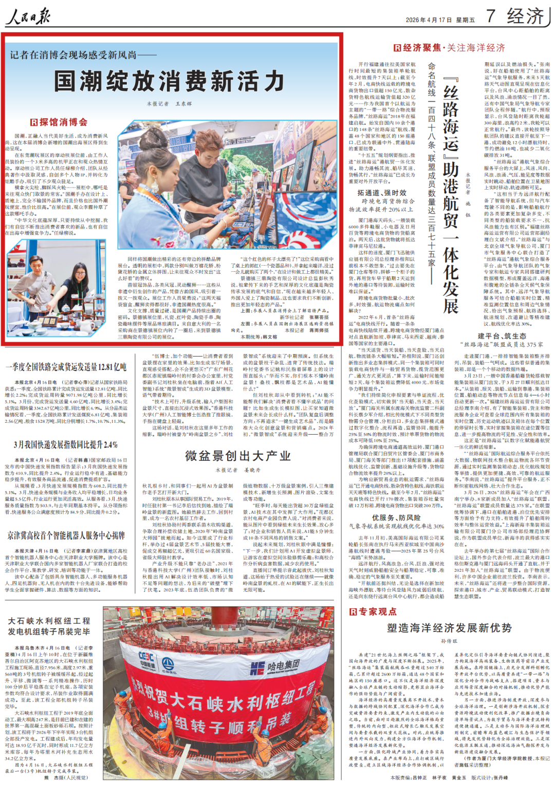 4月17日,人民日報第07版刊發(fā)文章《記者在消博會現(xiàn)場感受新風(fēng)尚——國潮綻放消費新活力(探館消博會)》,版面圖及全文如下: