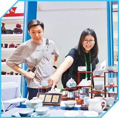 參展人員在國潮出海展區(qū)選購景德鎮(zhèn)陶瓷。人民日報記者 蔣雨師攝