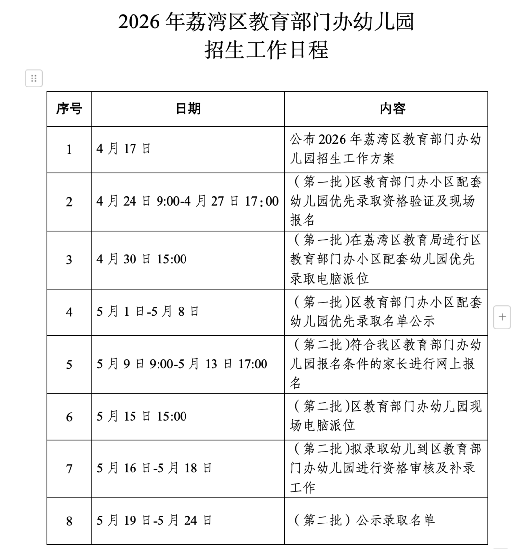 4月17日,廣州荔灣區教育局公布2026年廣州市荔灣區幼兒園招生工作方案。