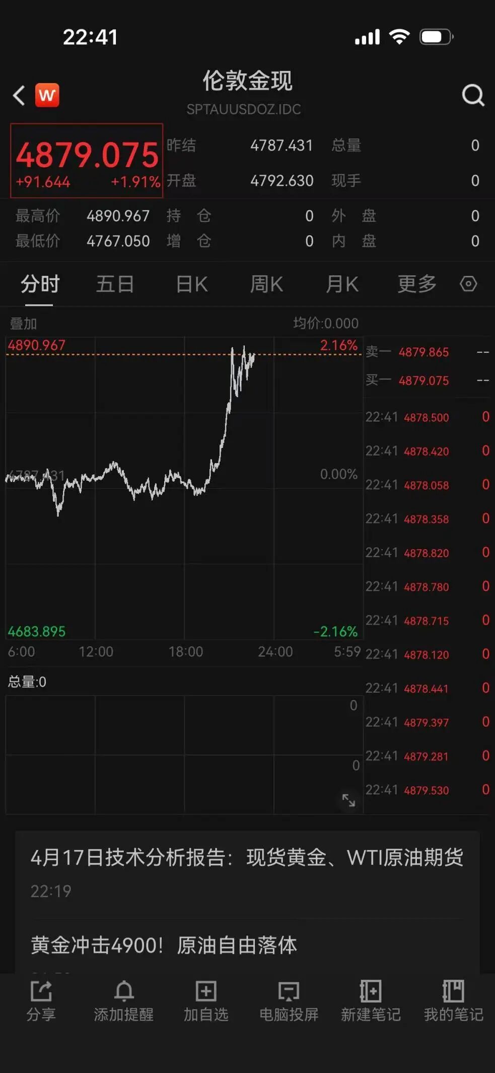 4月17日晚,受霍爾木茲海峽重新開通的消息影響,現貨黃金大漲超1.91%,暫報4879美元/盎司附近。