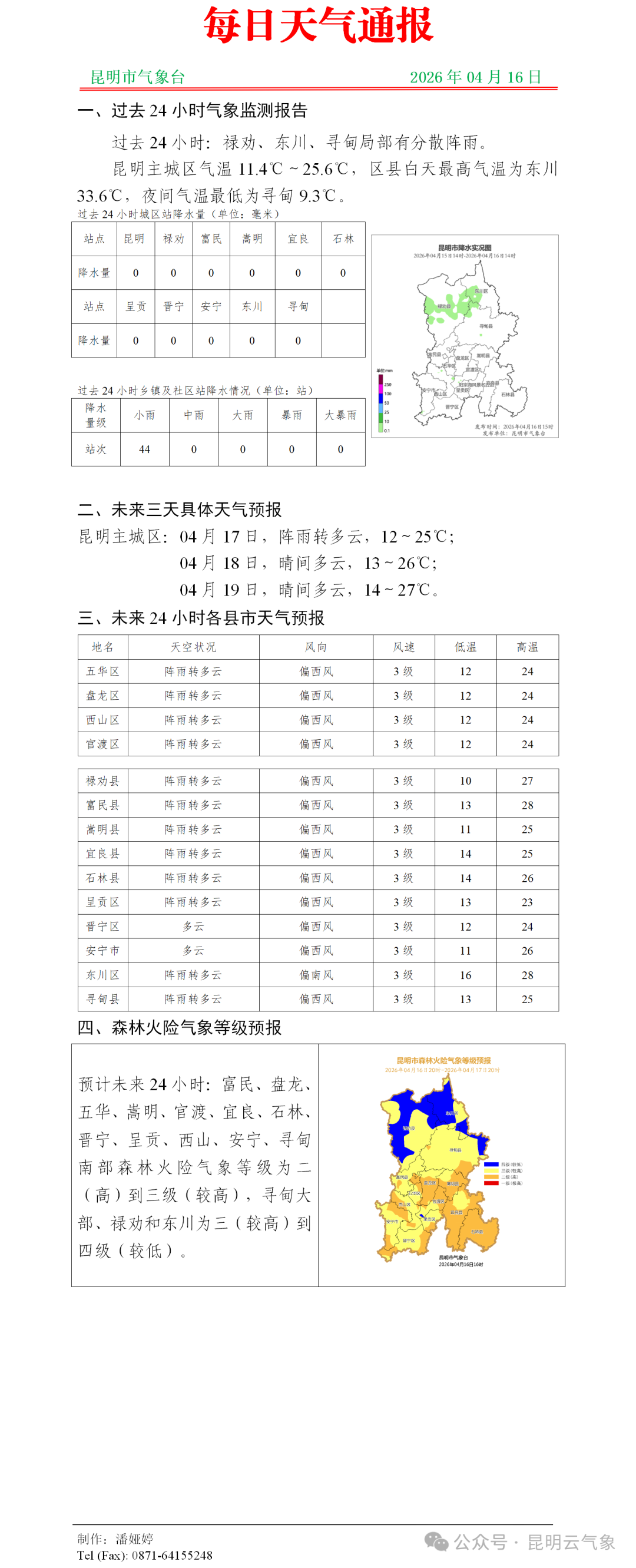 04月16日20時-04月17日20時:昭通市南部、曲靖市北部、昆明市東北部、文山州東部和南部、麗江市東南部陰有中雨局部大雨,昭通市北部、曲靖市南部、文山州西北部、昆明市西南部、玉溪市東部、紅河州東部、楚雄州北部、麗江市西北部、迪慶州、怒江州、大理州北部多云有陣雨,其他地區晴間多云。