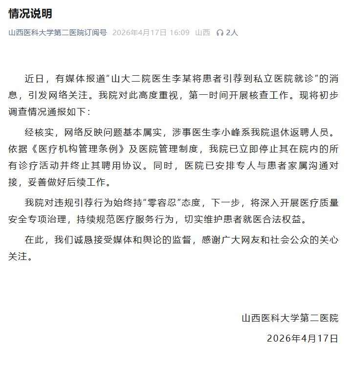 山西醫(yī)科大學(xué)第二醫(yī)院4月17日發(fā)布情況說明:
