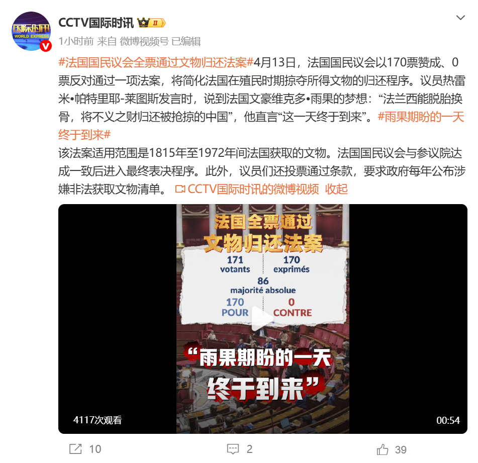 據CCTV國際時訊報道,4月13日,法國國民議會以170票贊成、0票反對通過一項法案,將簡化法國在殖民時期掠奪所得文物的歸還程序。