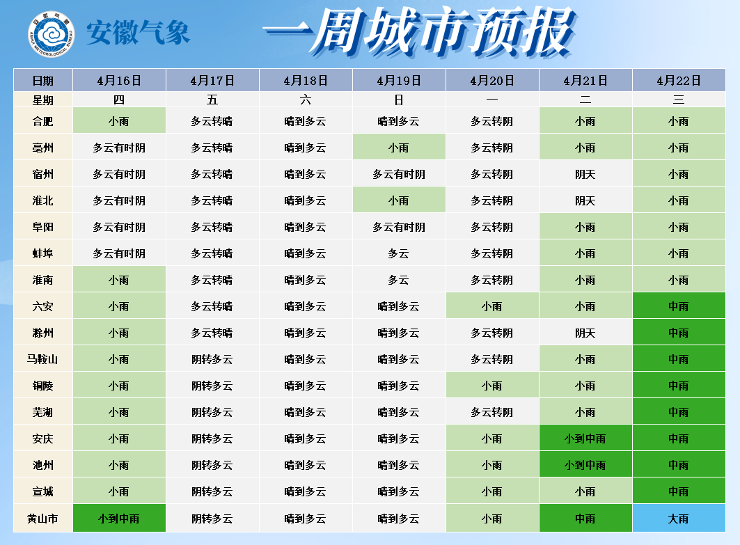 22日(周三):全省陰天。淮北地區(qū)有小雨;沿淮淮河以南有中雨,其中江南部分地區(qū)大雨。